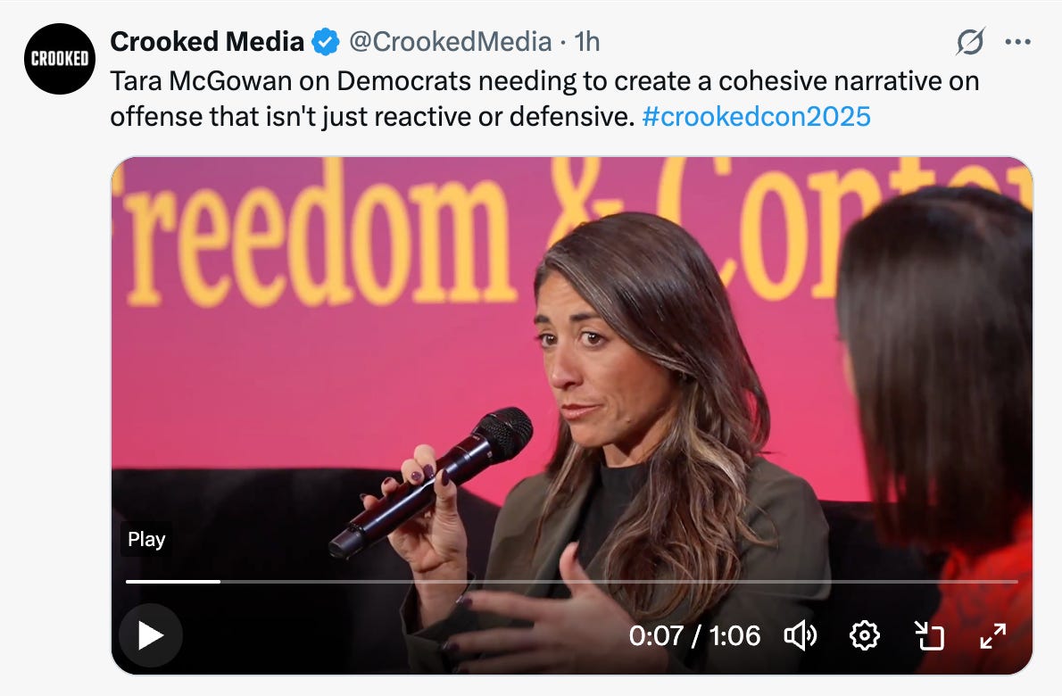 I’ve spent much of the day today in Washington, DC gathering with partners, allies, and old friends at Crooked Con, Crooked Media’s new conference. Among other topics, I had the opportunity to share my thoughts on the need for more investment in media and long term narrative infrastructure on the Left. Here’s a clip from my panel this morning: