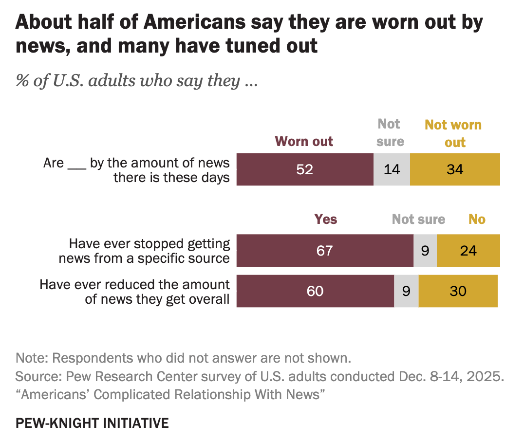 Then there’s the exhaustion factor: 52% of Pew respondents said they are worn out by the sheer volume of news. 48% say most of it isn’t even relevant to their lives. Two-thirds have ditched a specific source, and six-in-ten have cut back overall. Just 9% follow the news because they enjoy it.