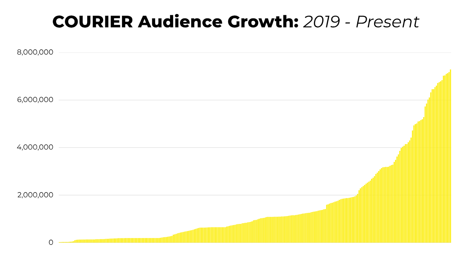 I know I’m a bit biased, but COURIER’s growth has been nothing short of extraordinary. A few weeks ago, our network surpassed 7 million combined social media followers and email subscribers, a testament to our team’s ability to connect with audiences where they are: in their email inboxes and on their favorite social platforms. Over the past year alone, COURIER has more than doubled its audience size and is now averaging hundreds of millions of monthly content impressions and post views on platforms like Facebook, TikTok, and Instagram.