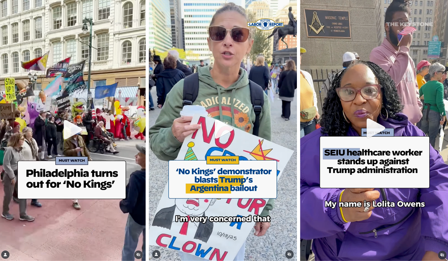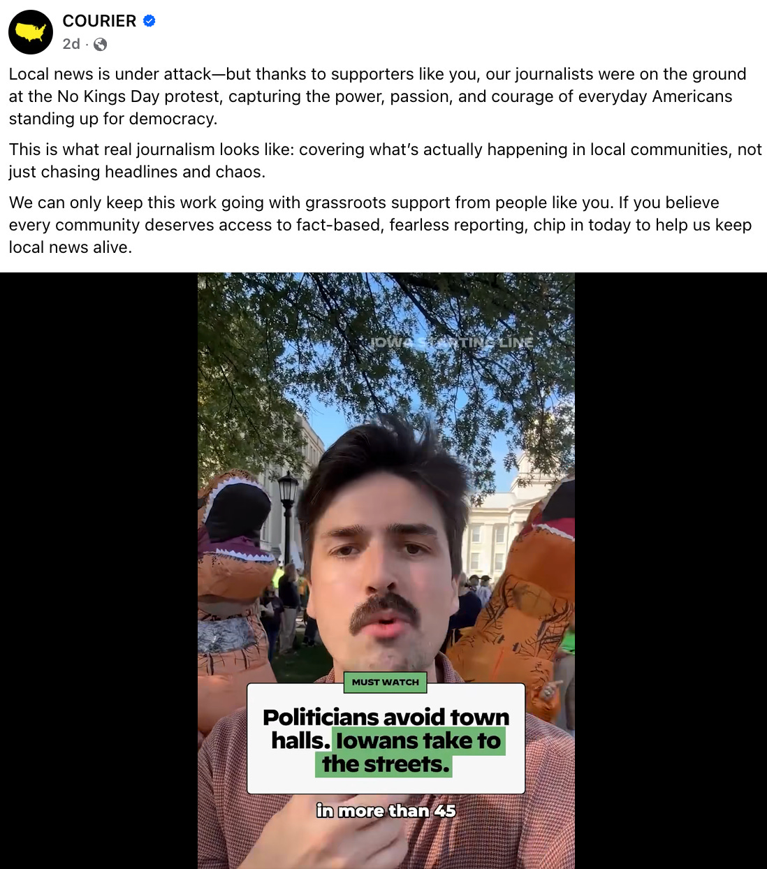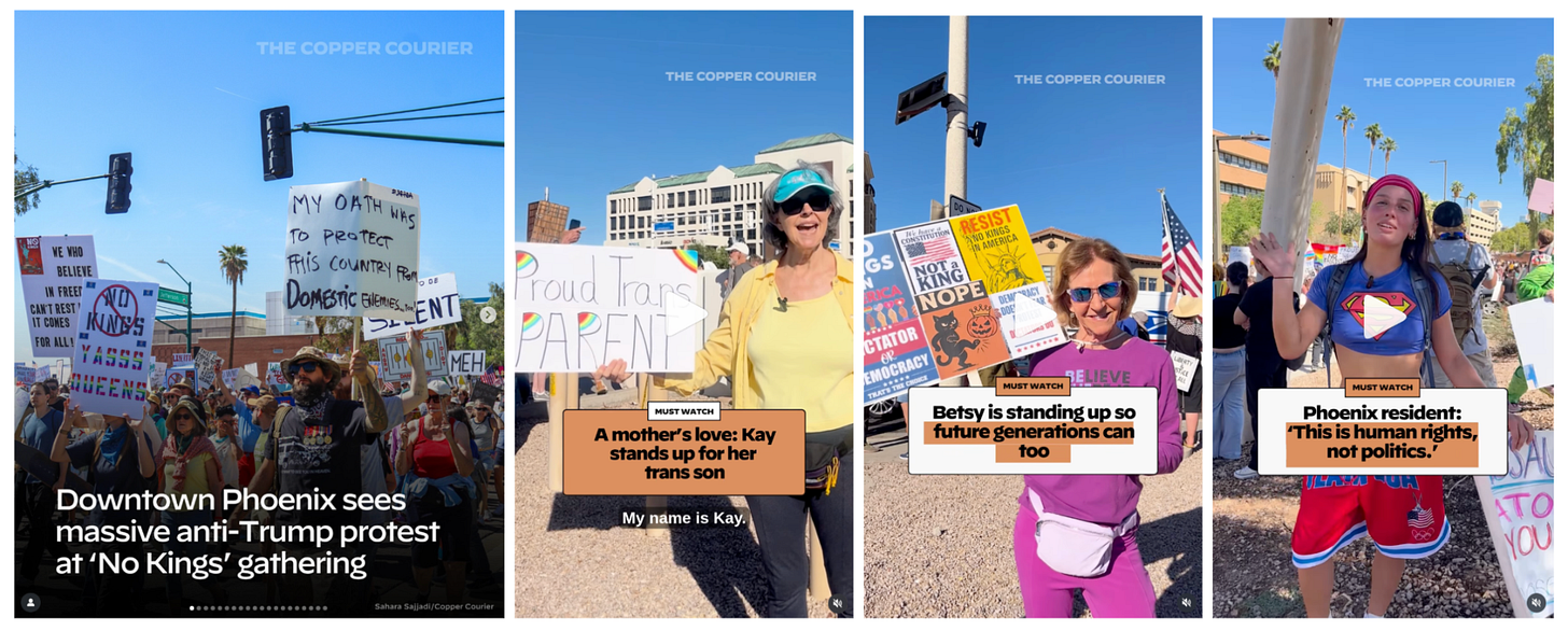 Over the course of the protests and the days following, COURIER published hundreds of pieces of original content that brought to light not only why Americans from all walks of life are standing up to this administration, but also tell the visual story of the peaceful opposition that stands in stark contrast to Trump and Republican’s ridiculous attempts to frame the protests as promoting hate, violence, or anti-Americanism. In the days that followed, our reporting has been viewed by millions of Americans on platforms where they spend their time - like Instagram, TikTok, and Facebook, and stands in deep contrast to the shameful decisions to bury or downplay the historic size and nature of the No Kings protests by legacy media outlets, including The New York Times: